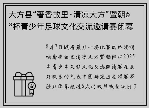 8月7日,随着最后一场比赛的终场哨响,“奢香故里·清凉大方”暨朝阳杯2025年青少年足球文化交流邀请赛在友好、欢乐的气氛中圆满完成各项赛事,胜利闭幕。经过6天的激烈较量,决出了U7---U12六个组别的冠、亚、季军归属。据了解,此次“奢香故里·清凉大方”暨朝阳杯青少年足球邀请赛,由中共大方县委、大方...